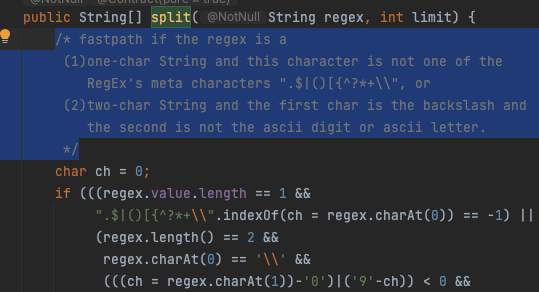 - 그런데 항상 Pattern을 힙 영역에 생성해서 사용하는게 좋은 방법은 아닙니다. 아래 사진을 보면 split 메서드인데 주석에 보면 fastpath라고 적혀있습니다.