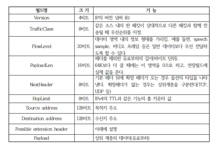 - 이 외에도 IPv6에서는 실시간 서비스 지원, 보안지원, 자동 환경 구성(IP 주소와 도메인 네임만으로 호스트의 통신 환경을 자동으로 구성해주 기능), 이동 라우팅을 포함한 라우팅 기능이 개선되도록 하였다.